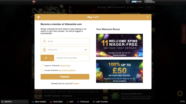 - Åpne registreringsskjemaet i menyen vår for VideoSlots nettcasino.